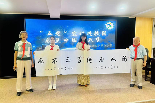 报告结束后,陈中仁为学校赠送了自己挥毫书写的“学而不厌,诲人不倦”书法作品,为学生们赠送了“追逐梦想,勇于探索,协同攻坚,合作共赢”探月精神书法作品。