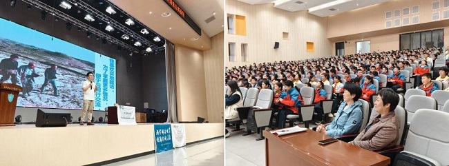 下午,学校报告厅座无虚席,中国科学院地球环境研究所郭湘宇博士的专题讲座《黄土·黄种人·黄土精神》将活动推向高潮。报告以陕北黄土剖面岩芯为切入点,270万年的沉积序列如史书般展开。“这片厚达百米的黄土层,保存着华夏文明与自然博弈的密码。”当讲到刘东生院士团队在沙漠腹地采集“夏商周断代工程”关键样本时,学生们对科学家的工作肃然起敬。郭博士以黄土的“沉积-搬运-再塑造”过程类比科研精神,寄语同学们“要像黄土般既有沉积知识的定力,又要有突破创新的魄力”。