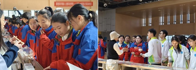校园体育馆内,200余件珍贵标本构建起立体科学课堂。秦岭野生动植物标本、玉米种子显微切片、多彩矿物以及砗磲、树轮、石笋等珍贵的展品,还原出秦岭生物多样性保护的鲜活图景。现场科学工作者结合展品实物,用通俗易懂的语言将复杂的科学知识娓娓道来,同学们仿佛置身于奇妙的科学世界,不时为那些新奇的科学发现发出惊叹。在互动环节,同学们积极踊跃提问,从日常生活中的科学现象到前沿科学技术,问题层出不穷,探索永无止境。科学家耐心细致地解答每一个问题,鼓励同学们保持对科学的好奇心和探索欲。