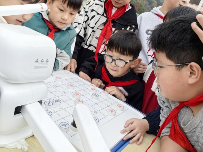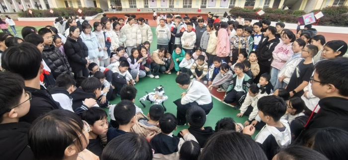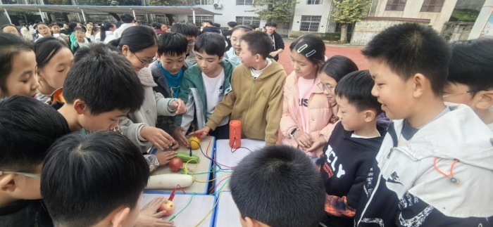 科学集市:从旁观者到探索者 “智能下棋机器人”前人头攒动,孩子们排着长队与机器人展开智慧对决,在落子间感受算法的逻辑魅力;“智能宠物狗”凭借憨态可掬的互动反应,让孩子们在抚摸与指令中理解传感器技术的应用原理;“水果钢琴”前围满了跃跃欲试的身影,孩子们用导线连接水果奏响简单的旋律,在玩闹中触摸到科学的脉搏。从好奇观望到主动提问,从谨慎尝试到大胆操作,科学集市通过“观察—体验—创造”的递进式互动,让孩子们完成了从知识旁观者到科学探索者的角色转变,现场洋溢着动手实践的热情与发现新知的喜悦。
