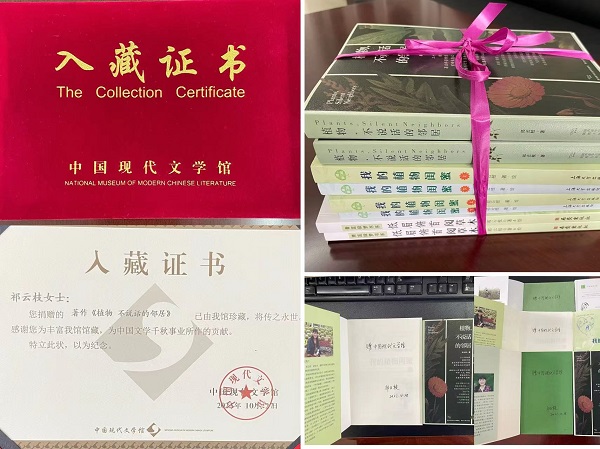 开幕式当天,祁云枝将自己创作的生态散文集和科普散文集《植物 不说话的邻居》《我的植物闺蜜》(上下卷)《低眉俯首阅草木》共八本书,捐赠给了中国现代文学馆。