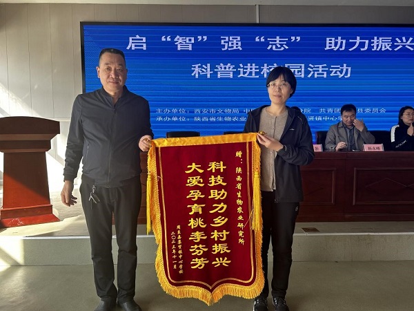 此外,陕西省生物农业研究所还分别向学校赠送科普书籍,助力学校科学教育工作发展。学校向陕西省生物农业研究所赠送锦旗,感谢他们将丰富的科普资源送到乡村学校、支持乡村教育工作。