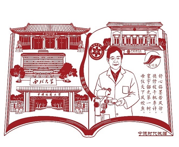 注:1)黄冈中学毕业后,舒德干有幸入读北大、西大和地大,强健体魄,潜心学业(他后来创立的“古虫动物门”包括西大动物,地大动物和北大动物,故有“三大”之谓)。剪纸中也展现了该三所大学和中科院的门徽,暗示其人生历程;2)“第一树”指他从寒武纪生命大爆发迷题中率先揭示出地球“第一动物树”,为当今动物星球成功奠基;3)基督教中的“夏娃”虚无缥缈,实无其人,而5.18亿年前的“天下第一鱼”昆明鱼目(以凤姣昆明鱼为代表)堪称自然界真实存在的“真夏娃”,或称“科学夏娃”。