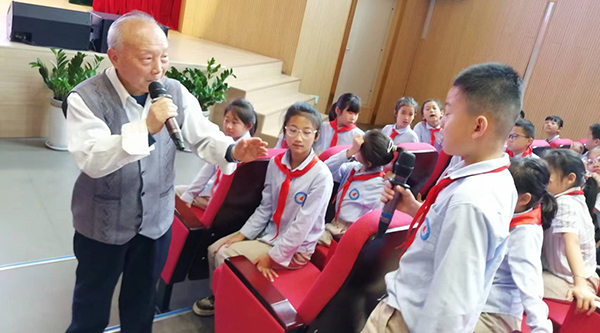 在提问环节,同学们争先恐后地举手问:陈爷爷,什么是高速摄像机?能拍多少照片?除了拍摄原子弹爆炸,还可以应用在哪些方面?孩子们的提问充满着奇思妙想,闪耀着科学种子的金色光芒。陈中仁旁征博引地耐心回答,鼓励孩子们将来要让心里的科学种子发芽开花,结出丰硕成果,并为回答问题好的同学赠送了书法作品。