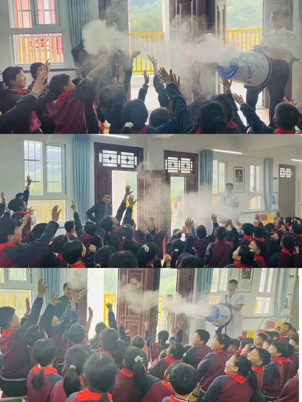 其后,研究所邀请陕西省优秀科普使者谭季钊博士带着各种实验器材和材料,现场为孩子们带来了一场科学实验秀,通过火焰掌、酸碱变色、氦气变声、液氮冷冻-天女散花、液氮冷冻-香蕉砸核桃、空气炮、品尝CO2的味道、液氮蘑菇云、水火箭等的展示,引爆了现场气氛,将活动推向高潮。孩子们积极参与其中,近距离观察实验现象,踊跃动手实践。同学们纷纷表示,这次活动真是大开眼界,不仅增长了知识,锻炼了动手能力和科学思维,还感受到了科学的无穷魅力和乐趣。