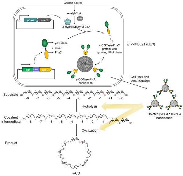 近日,陕西省微生物研究所杨国武研究员带领的环糊精研究团队在JCR一区期刊《Microbial Cell Factories》(IF 6.4)在线发表了题为“Economical synthesis of -cyclodextrin catalyzed by oriented cyclodextrin glycosyltransferase displayed on bacterial polyhydroxyalkanoate nanogranules”的研究论文,提出了一种基于定向固定化 -CGTase-PHA纳米微球高效合成 -环糊精的新策略。