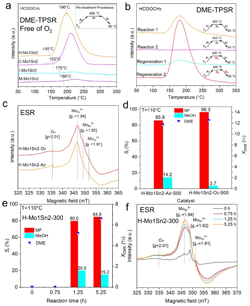研究团队采用水热法构筑了具有丰富Mo5+物种的Mo-Sn催化剂(H-Mo1Sn2)。与传统的共沉淀法、浸渍法、机械混合法相比,水热制备的H-Mo1Sn2上无定形MoOx物种高度分散在SnO2表面,实现了在110 下二甲醚低温氧化高选择性制备甲酸甲酯,比已有报道的反应温度降低了50 (图1)。