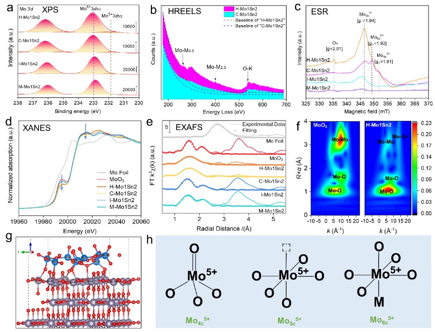 Mo物种的电子状态和配位结构是影响催化活性的关键(图2)。研究团队通过对催化剂的深度表征(低温 ESR、(quasi in-situ)XPS、(in-situ)XAFS、AC HAADF 等),发现新鲜H-Mo1Sn2催化剂存在较多的Mo5+,并且在反应过程中存在Mo6+向Mo5+的转变,反应前后Mo5+主要以不饱和五配位的五价钼(Mo5c5+) 结构存在,通过进一步设计实验,确证了活性中心Mo5+5c 可在反应中原位生成,并且Mo中心原子高度配位不饱和(第一壳层总配位数为4.4)且Mo-O键键长明显缩短(1.77 ?,2.04 ?)。