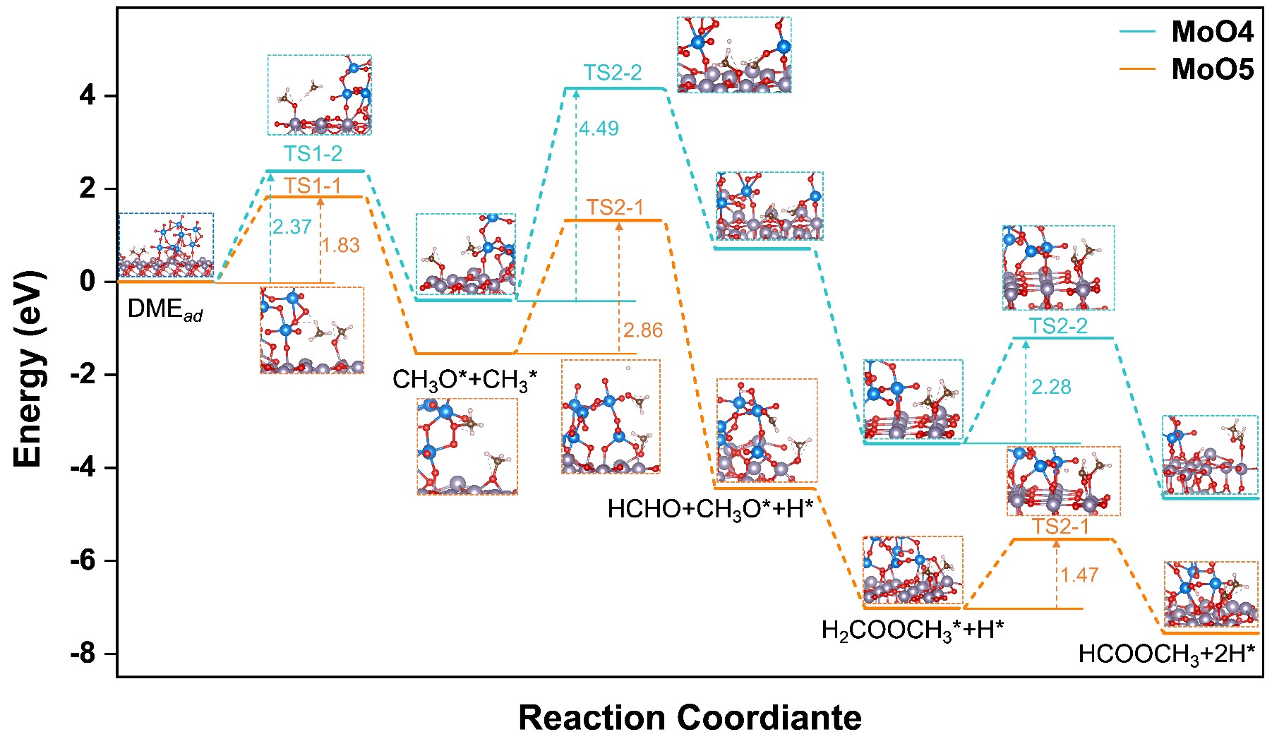 结合多种表征技术、原位实验和理论计算,揭示了不饱和五配位五价钼Mo5c5+是低温氧化活性中心,该结构在CH3O*中间体中C-H的活化氧化决速步起到了关键作用(图4)。