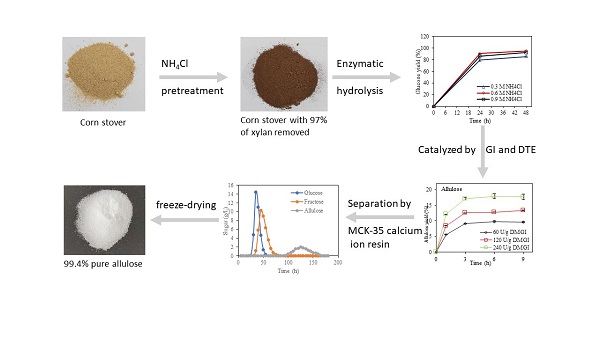 D-阿洛酮糖可由葡萄糖异构酶和阿洛酮糖异构酶催化葡萄糖而获得。农业废弃物中纤维素酶解后会生成大量葡萄糖,这为利用廉价的农业废弃物制备高附加值D-阿洛酮糖提供了可行的途径。然而农业废弃物结构非常复杂,除了纤维素外,还含有大量的半纤维素,半纤维素的存在一方面会制约纤维素的酶解,另一方面其降解产物会加剧后期D-阿洛酮糖的分离纯化难度。因此,移除农业废弃物中的半纤维素是制备高纯度D-阿洛酮糖的关键。为解决这一问题,本研究引入了一项创新技术,通过氯化铵预处理,成功去除了玉米秸秆中约97%的半纤维素。同时,这一处理打破了农业废弃物细胞壁结构,显著提高了纤维素多糖的生物转化效率。随后,利用葡萄糖异构酶和阿洛酮糖异构酶将纤维素降解产物定向转化为高附加值的D-阿洛酮糖。通过离子交换树脂脱盐、分离纯化、冷冻干燥等工艺步骤,最终得到了纯度高达99.4%的D-阿洛酮糖。