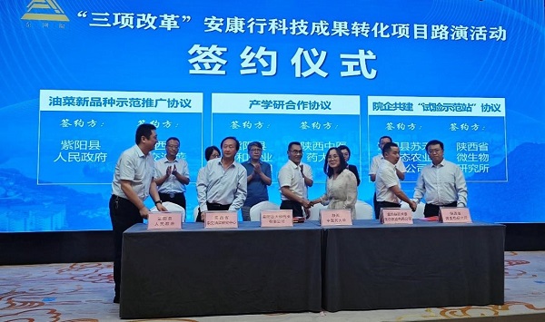 5月17日,由陕西省科技厅和安康市人民政府主办,安康市科技局、紫阳县政府、省创业投资协会承办的“‘三项改革’安康行”科技成果转化项目路演活动在安康市紫阳县举办。此次活动旨在搭建科技创新成果与企业实际需求的对接平台,促进科技成果转化和产业高质量发展,提升科技创新能力和区域经济发展水平。其中,陕西省微生物所微生物资源前期开发研究团队研发的撩酸菜稳产工艺项目参加此次路演活动。万一所长代表省微生物所与紫阳县苏禾秦生态农业有限公司签订共建“试验示范站”协议。