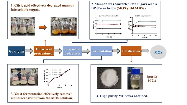 陕西省生物农业研究所农业生物技术研究中心在国际生物技术期刊《Bioresource Technology》(中科院一区TOP期刊,影响因子11.4)发表研究论文,报道了一种利用瓜尔胶高效制备高纯度甘露低聚糖益生元的新策略。研究团队通过结合柠檬酸预处理和甘露聚糖酶解技术,显著提高了甘露低聚糖的产率,成功解决了传统方法中低聚糖转化效率低下和分离纯化步骤复杂的问题。