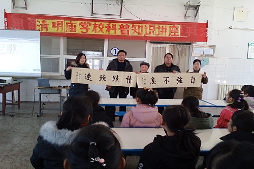 12月20日上午,在富平县梅家坪镇清明庙中小学,学校政教主任李向国主持陈中仁研究员科普报告会,郭治年校长和200名余名师生出席或参加临听报告会。报告会后,学生们提问能不能在月球上生活?中国什么时候能探测火星?陈中仁一一作答,并赠送书法作品“自强不息 积跬致远”给学校。