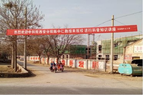 富平县流曲镇中心小学挂起横幅欢迎陈中仁作科普报告