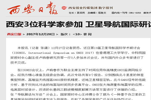 本报讯(记者 张潇)12月27日记者获悉,近日第19届卫星导航国际学术研讨会(ISGNSS,International Symposium on GNSS 2017)在香港理工大学举行,中科院国家授时中心副主任卢晓春研究员等一行3人参加本次会议,并与国内外众多专家进行了技术交流。