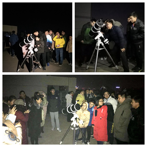 为了使大家能更好的观赏月全食的演变过程,充分了解月全食发生的天文原理,工作人员提前在综合楼顶楼架设好天文望远镜。当天晚上,天气虽然寒冷,但是十分晴朗,非常有利于月全食观赏。19时左右,一轮明月已经挂在东方夜空。19时48分,月食开始初亏,观测点人群攒动,熙熙攘攘,在工作人员的引导和讲解下,大家开始秩序井然的通过望远镜仔细观看月全食发生时的月球表面细节变化。20点51分,月食进入食暨,此时月亮完全进入了地影,一轮古铜色的圆月悬挂在天边,伴着点点星光,点缀着冬夜苍穹。“快看红月亮!”,霎时,活动现场一阵喧闹,气氛热烈,大家对这一震撼天象无不感慨赞叹。
