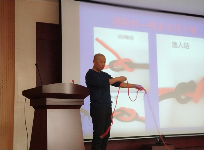 讲座从野外生存概念、野外环境类型、野外风险防范、野外生存技能等四方面,介绍了常见户外装备、取水取火方法、营地与帐篷选择、方向与路线判定等户外实用可操作技能。刘前锋亲身示范了户外背包的整理与背法、登山杖的使用省力技巧、常用与急用绳结的打法等,并结合秦岭鳌太穿越综合分析了一些个人案例。