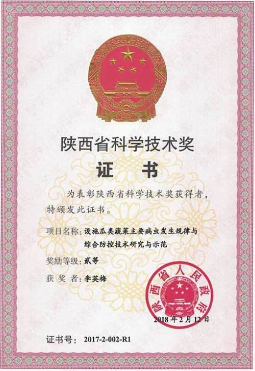 由李英梅副研究员主持完成的“设施瓜类蔬菜主要病虫发生规律与综合防控技术研究与示范”项目,也获2017年度陕西省科学技术奖二等奖。该项目针对设施瓜类蔬菜病虫发生种类多、为害重、损失大、综合防治技术体系不健全、食用安全受到严重威胁开展技术攻关。该项目系统甄别了病虫种类,明确了主要病虫害的发生规律;集成了低温等离子体、黄板+防虫网联用、摘花、土壤清洁、组合用药等绿色防治技术体系,为病害防治开辟了新途径。自2006年,该团队建立了多层次、多渠道的技术推广体系,开展各层次技术培训120余场,培训菜农达15000多人次,发放技术宣传资料10万份,技术咨询达万余人次,技术入户率达90%,显著提高了广大种植者的技术水平,累计有效推广面积88.04万亩,技术覆盖率87.6%。