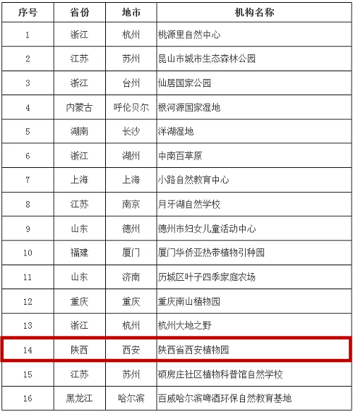 近日,生态环境部宣传教育中心官网公布了全国第四批自然学校试点名单,全国有16家单位成功入选国家自然学校能力建设项目,其中陕西省植物园是西北地区唯一入选单位。