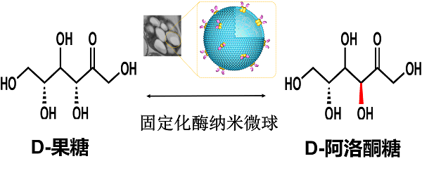 研发的生产工艺以D-果糖为原料,采用自主研发的固定化酶纳米微球低成本催化合成D-阿洛酮糖。该工艺中的固定化酶纳米微球不仅制备工艺简单,成本低廉;而且催化活性高(酶活力为649.3 U/g),稳定性高(60oC下保存24h后,酶活力几乎没有任何损失),重复利用 8 次后没有明显的酶活力损失。在分离纯化工艺中,课题组采用先进的模拟移动床(SMB)技术对D-阿洛酮糖进行连续分离纯化,得到高纯度(>99%)、高得率(>95%)D-阿洛酮糖,同时实现了D-果糖的回收利用(果糖回收纯度为99%以上,回收率为95%以上),生产成本大幅度降低。