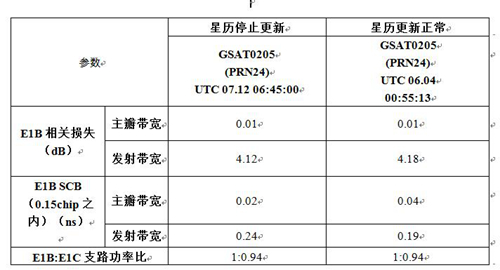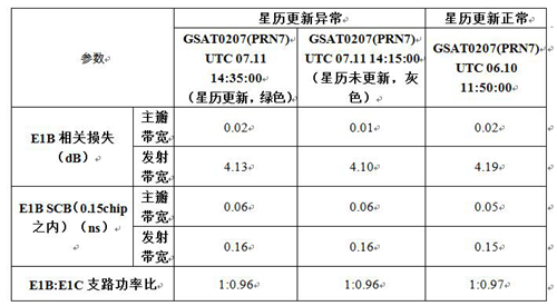 对GSAT0207卫星E1B信号在星历更新异常状态与星历更新正常状态下的信号质量参数进行比对分析。如表1所示,故障前后各项参数差异微小,信号性能保持一致。