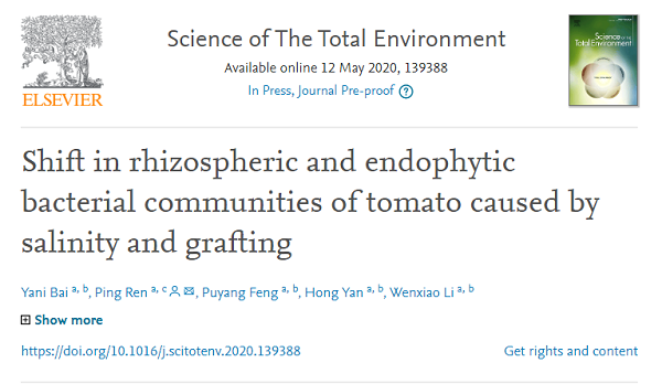 5月12日,陕西省生物农业研究所助理研究员白亚妮博士为第一作者,生物农业所任平副研究员为通讯作者在Science of The Total Environment在线发表了题为“Shift in rhizospheric and endophytic bacterial communities of tomato caused by salinity and grafting”的研究论文,研究揭示了盐分及嫁接对番茄微生物群落的影响,进一步丰富了盐水灌溉条件下植物的促生理论。