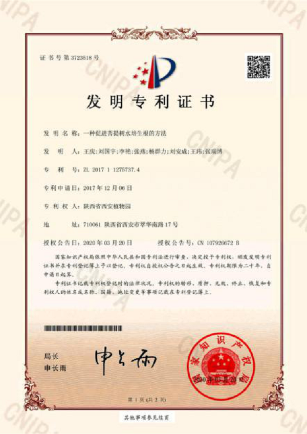 近日,由陕西省西安植物园王庆、刘国宇、李艳等完成的 “一种促进菩提树水培生根的方法”获得国家发明专利授权(专利号: ZL 2017 1 1275737.4)。