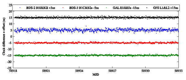 图3 不同GNSS信号长基线全视比对的钟差序列图