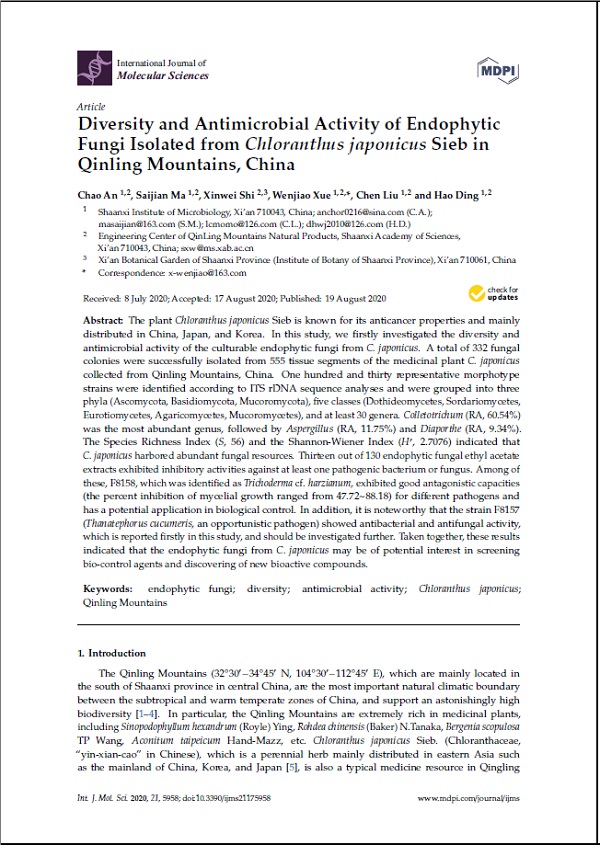 陕西省微生物研究所微生物代谢产物研究中心安超助理研究员等以题为“秦岭银线草内生真菌多样性及其抗菌活性研究(Diversity and Antimicrobial Activity of EndophyticFungi Isolated from ChloranthusjaponicusSieb inQinling Mountains, China)”在国际学术期刊INTERNATIONAL JOURNAL OF MOLECULAR SCIENCES发表研究论文。该期刊属于SCI二区杂志,期刊影响因子4.556,主要报道内容包括微生物学、化学科学、微生物资源与分类学、环境微生物学等领域的研究进展。