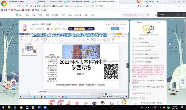 2月6日晚19:00-21:00,陕西招生组组织8名国科大陕西籍在校优秀同学在腾讯会议和哔哩哔哩网站同时直播2021年国科大本科招生陕西专场活动,同学们以亲身经历分享在国科大的学习生活及感受。会后由招生组主管李勃老师答疑解问。