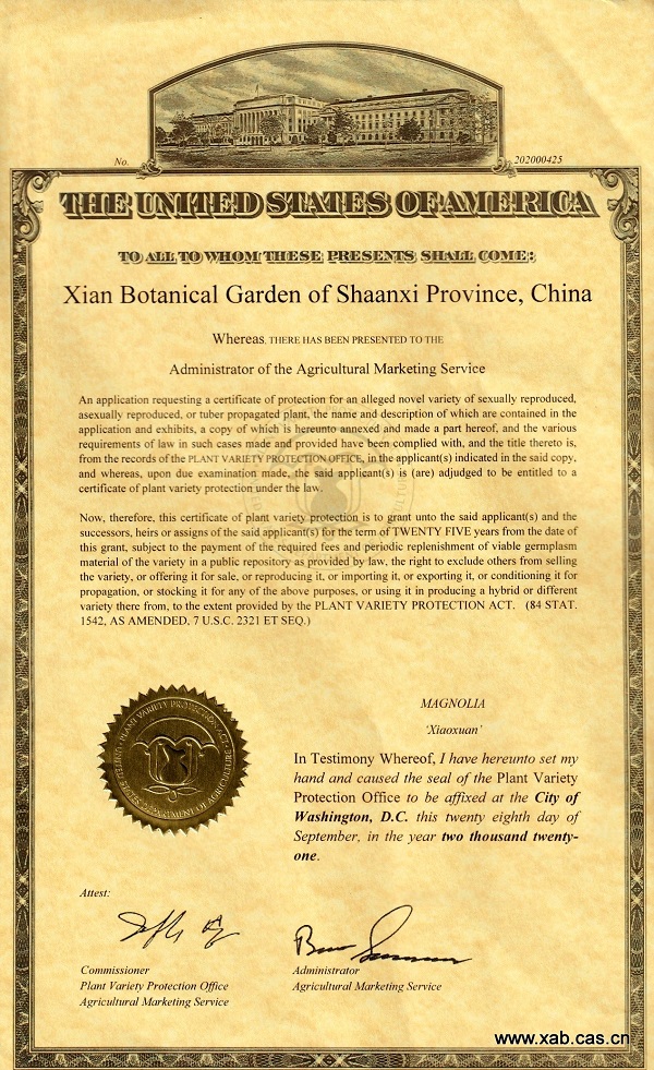 由陕西省西安植物园木本育种团队自主培育的玉兰新品种‘小璇’日前通过美国农业部植物多样性保护办公室(U.S. Department of Agriculture PLANT VARIETY PROTECTION OFFICE)材料审定,获得新品种权证书(品种权号202000425)。获得授权后,“小璇”玉兰将正式进入美国花卉市场。