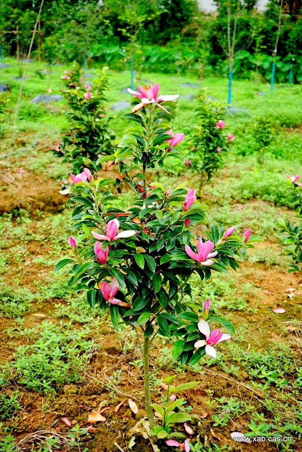 玉兰新品种‘小璇’是2008年春季人工杂交后获得的仅一粒杂交种子长成的唯一一株杂交实生苗,其母本为木兰科木兰属落叶品种星花玉兰‘睡莲’(Magnolia stellata‘Waterlily’),父本为含笑属常绿品种阔瓣含笑‘新含笑’(Michelia platypetala ‘Xin Hanxiao’)。2013年7月上旬杂交苗第一次开花,花量逐渐增大。‘小璇’玉兰与其白色花的母本和父本不同,花色为粉色,并且株形更为紧凑矮小。8年生种苗株高仅为1.6m,是近缘种‘红笑星’玉兰同龄种苗株高的2/5,叶片更小,夏季花期更长,因此更具观赏性。
