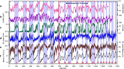 论文作者将4个元素比值归一化后进行整合,生成陆地—海洋集成记录,从而揭示出千年尺度气候变化在过去150万年持续存在,气候突变事件的数量和幅度在冰期和间冰期不同气候背景下有显著差异。在中更新世之前,气候突变的剧烈程度主要受到岁差和地轴倾斜度变化的影响,而到中更新世之后全球冰量和轨道参数均可调制千年尺度气候事件的变化幅度。