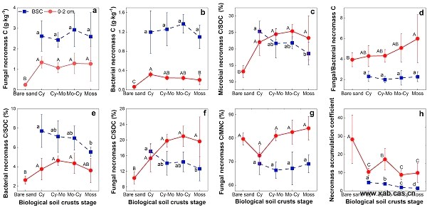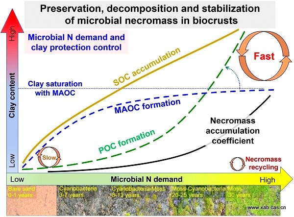 生物土壤结皮覆盖了全球1790万平方公里的面积(大约占到12%的地球陆地面积),其形成加速了干旱和半干旱地区以及寒冷环境中碳和营养物质的生物地球化学循环过程。最近越来越多的证据表明微生物残体是良好发育土壤有机碳(SOC)的主要来源。当前关于初始土壤(生物结皮覆盖)形成过程中微生物残体对SOC形成的贡献,以及驱动微生物残体积累、分解和稳定因素的定量信息尚不清晰,这极大地限制了我们对于荒漠生态系统微生物介导下碳循环过程的理解。