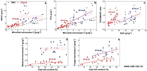 四种土壤胞外酶(即β-1,4-葡萄糖苷酶、β-1,4-N-乙酰氨基葡萄糖苷酶、亮氨酸氨基肽酶和碱性磷酸酶)的活性随着真菌和细菌残体的增加而增加,表明活微生物活性的提高加速了残体物质的周转和形成。生物土壤结皮形成序列中微生物的氮(N)限制促进了微生物释放的N获取酶(如β-1,4-N-乙酰氨基葡萄糖苷酶和亮氨酸氨基肽酶)产量的增加,以分解微生物残体贡献土壤溶液中养分的增加(图3)。在生物土壤结皮形成序列中,微生物N限制的逐渐降低也是初始土壤形成过程中微生物残体积累的重要因素。微生物N限制和粘粒保护的缺乏使微生物对残体物质快速再利用,导致低的微生物残体积累系数(即微生物残体物质与活体微生物生物量的比值,生物土壤结皮平均为9.6)。因此,在生物土壤结皮形成序列的沙质土壤中,微生物残体物质对SOC的贡献低于完全发育的土壤(33%-60%,基于文献数据)。微生物N限制、N-获取酶活性与微生物生物量N之间的比例增加、粘粒保护的缺乏和MAOC的饱和(图4),导致了生物结皮覆盖的沙质土壤中微生物残体物质对SOC的贡献较低。