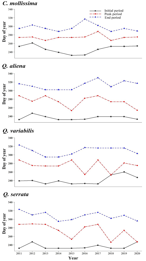 研究人员从2011-2020连续10年对同域分布的板栗、锐齿槲栎、栓皮栎和短柄枹栎4种壳斗科植物的种子雨进行监测。所选取的同域分布的4种物种是广泛分布于秦岭的优势种,在秦岭生态系统中占有重要地位。结合10年期间的气候数据,探讨了4种植物种子雨动态变化对气候因子的响应。研究结果表明:栗属(Castanea)的板栗和栎属(Quercus)的其它3种栎树在种子雨下落初期、末期以及整个种子雨下落过程持续时间均存在显著差异,说明板栗与其他3种栎属植物之间存在一定的生物学差异,比如说三种栎属植物的种子很容易萌发,在适当的条件下就会发芽。但板栗有有休眠期,必须经过休眠期才会发芽,这可能反映了不同植物对环境的适应策略。因此,不同树种的种子雨下落时间,尤其是高峰期并不一致,不完全集中在同一时期,这在很大程度上可以促进优势种的共存,缓解物种间的竞争,为维护森林物种多样性奠定基础。这也是植物对环境的一种生殖或适应策略。说明不同物种尤其是不同属植物具有不同的繁殖策略,不集中、不扎堆开花和结果,利于它们可以更好地同域共存。