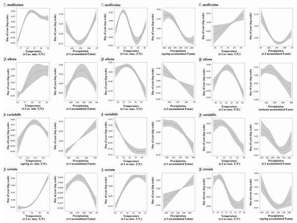 研究发现,4种种子大部分与降水呈非线性关系,说明适宜的降水有利于植物养分的积累和种子的成熟,而过多或过少的降水可能会影响植物的光合作用。这不利于种子成熟,并可能导致种子提前或延迟落种。综上所述,4种植物的种子降雨动态在不同时间尺度上对温度和降水具有不同的响应和敏感性,这也可能是不同植物对环境的适应策略。说明它们可以通过对环境的适应避免对有限资源的激烈竞争。
