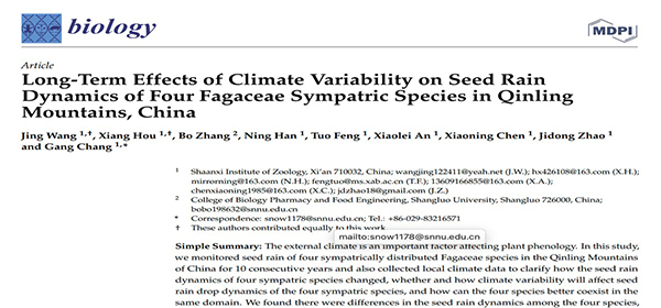 该研究成果以题为“Long-Term Effects of Climate Variability on Seed Rain Dynamics of Four Fagaceae Sympatric Species in Qinling Mountains, China”发表在生物学领域JCR一区期刊Biology(影响因子5.079)上。陕西省动物研究所王京助理研究员和侯祥助理研究员为该论文共同第一作者,常罡副研究员为文章通讯作者。该项研究得到了国家自然科学基金(31901085、32172436)、陕西省重点研发计(2021NY-042)、陕西省自然基金(2021JQ-841)、陕西省科学院科技计划(2019K-PT, 2022K-06, 2022K-16)等项目的资助。