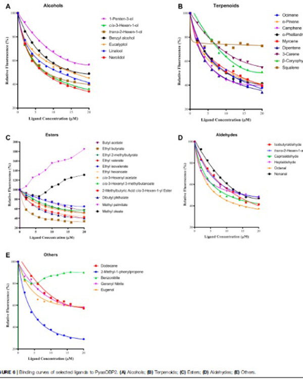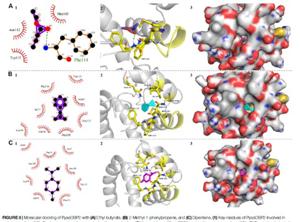 枣食芽象甲Scythropus yasumatsui(异名Pachyrhinus yasumatsui)属鞘翅目(Coleoptera)象甲科(Curculionidae),是一种严重危害红枣的重大害虫。近年来,枣食芽象甲在我省榆林、延安等地黄河沿岸枣区连年暴发成灾,为害呈加重趋势,而长期大量化学药剂的使用,导致该虫产生抗药性,对环境和食品安全构成严重威胁。因此,目前亟需探索一种绿色环保的防控技术。由于该虫仅取食枣树幼芽和嫩叶,意味着嗅觉在其识别特定寄主挥发物方面具有重要作用,而气味结合蛋白(OBPs)基因是昆虫发挥嗅觉功能的一类关键性蛋白基因。基于以上研究背景,本课题组从枣食芽象甲触角组织中克隆和鉴定出气味结合蛋白基因PyasOBP2,运用qRT-PCR技术分析了该基因在枣食芽象甲不同组织中的表达情况,通过原核表达纯化获取PyasOBP2目的蛋白,并利用荧光竞争性结合试验对该蛋白与38种枣树气味挥发物配体的结合特性进行了测定和分析。结果表明PyasOBP2与22种挥发物具有结合活性,尤其与丁酸乙酯、2-甲基-1-苯基丙烯和D-柠檬烯这3种气味挥发物的结合能力最强。分子对接(molecular docking)分析表明PyasOBP2与3种挥发物分子通过氢键和范德华力作用进行结合,其中氨基酸残基Phe114对于两者间紧密结合起到了关键作用。