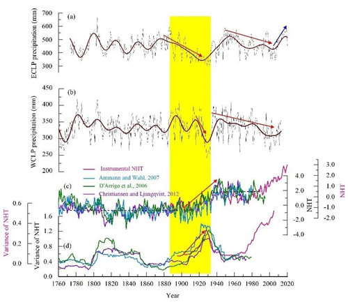 黄土高原东(a, 本研究)、西(b, Liu et al., 2019)部水文年降水对比及1920年代末期干旱与北半球温度变化(NHT, c, d)的关系。图片均由论文作者提供