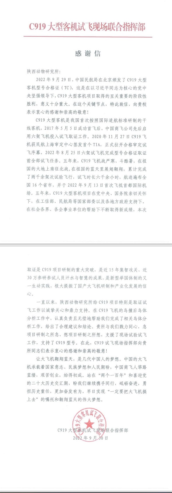 近日,陕西省动物研究所收到来自C919大型客机试飞现场联合指挥部的感谢信,字里行间是对试飞工作中鸟击防撞事件中金学林教授级高工等研究人员的主动作为、大力支持、用心做事的肯定与感激。短短的感谢信承载着我国航空航天事业对研究所科研人员工作的满意和肯定。