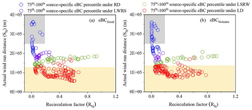 四种气流类别下75th-100th分位的化石燃料eBC(a)和生物质eBC(b)的质量浓度随标量传播距离和气流循环因子改变的分布。灰色高亮区域气流流通良好的情况,黄色高亮为气流趋于静止的情况。