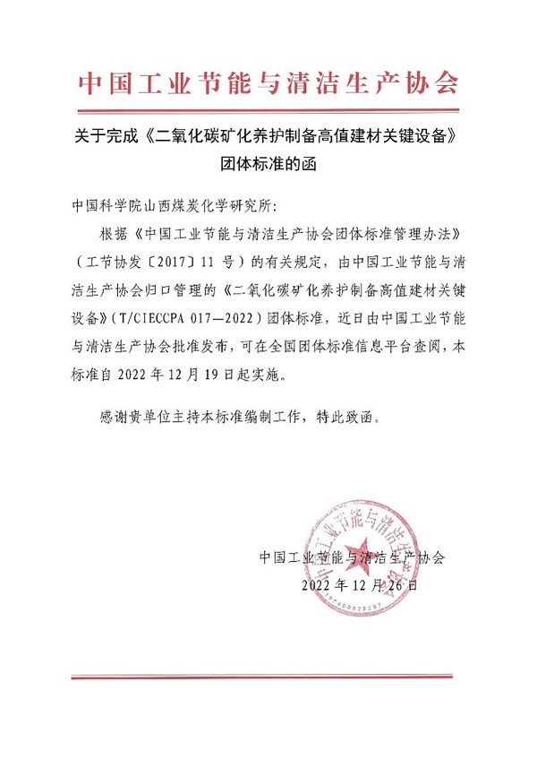 近日,中国科学院山西煤炭化学研究所主持制定的团体标准《二氧化碳矿化养护制备高值建材关键设备》(T/CIECCPA 017-2022)由中国工业节能与清洁生产协会正式发布实施。该标准规定了二氧化碳矿化养护制备高值建材关键设备的技术要求、试验方法和检验规则。适用于二氧化碳矿化养护制备高值建材关键设备的设计和制造;可广泛应用于纳米碳酸盐、多孔轻质保温材料、轻质建筑节能材料、吸音材料和隔音材料等生产工艺采用二氧化碳矿化养护设备时参照执行。
