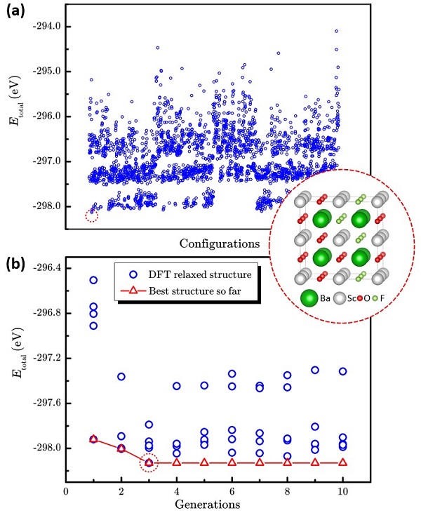 传统枚举法和辣搜(LAsou)法在BaSc(OxF1?x)3 (x=0.667)体系预测的表现。(a)2664个枚举结构和最稳定结构的总能量散点图。(蓝色圆圈代表每个结构的能量,红色虚线圆圈代表能量最低的结构。)(b) 辣搜(LAsou)方法搜索过程中总能量随搜索代数的演化。(红色三角代表历史上搜索的最低能量结构。)