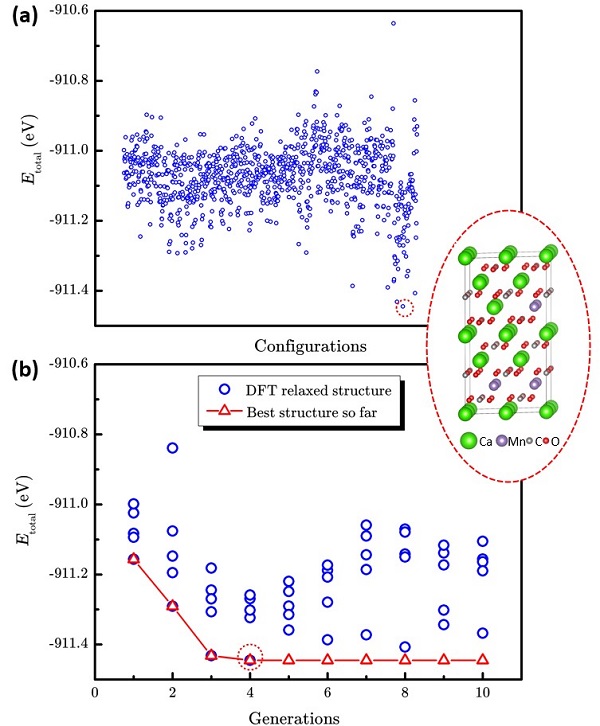 传统枚举法和辣搜(LAsou)法在Ca1?xMnxCO3 (x=0.25)体系预测的表现。(a)1033个枚举结构和最稳定结构的总能量散点图。(b)辣搜(LAsou)方法搜索过程中总能量随搜索代数的演化。