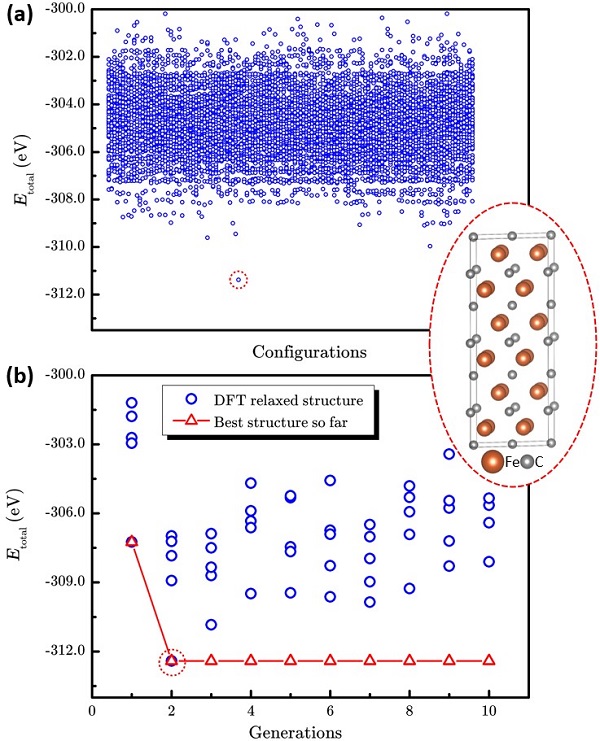 传统枚举法和辣搜(LAsou)法在ε-FeCx (x=0.5)体系预测的表现。(a)10496个枚举结构和最稳定结构的总能量散点图。(b)辣搜(LAsou)方法搜索过程中总能量随搜索代数的演化。