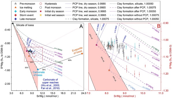 中国科学院地球环境研究所金章东研究团队,联合法国岩石地球化学研究中心、巴黎地球物理研究所、德国美茵茨大学等国际科学家,利用黄河中游季节性河水样品,分析了河水Mg和Sr同位素组成,发现引入五端元混合模型可以有效解释黄河中游Mg移除过程以及87Sr/86Sr季节变化。首先,他们搭建了方解石-白云石溶解框架,结合黄土淋滤实验数据,并根据优先碳酸盐岩移除过程的分配系数,刻画了碳酸盐岩溶解过程中不同矿物溶解-再沉淀过程对Sr/Ca和Mg/Ca的响应。随后,他们根据方程确定了干旱季节碳酸盐岩相对硅酸盐岩风化的贡献比例,再结合季风期下降的δ26Mg和87Sr/86Sr下降值,确定了季风期碳酸盐岩的贡献比例有所上升(约10%)。在确定了碳酸盐岩与硅酸盐岩贡献比例的基础上,他们再利用瑞利分馏模型,模拟了次生碳酸盐优先沉淀与粘土生成对镁同位素的分馏。模型结果表明,δ26Mg和87Sr/86Sr季节变化的初级控制要素是季风降雨导致的碳酸盐岩溶解,其次是次生碳酸盐优先沉淀过程,可向偏重方向分馏镁同位素约0.17‰至0.39‰;紧随着的是粘土的生成,将进一步降低河水镁同位素组成,最终造成我们在大陆尺度上所能观测到的河水镁同位素季节变化(如下图)。