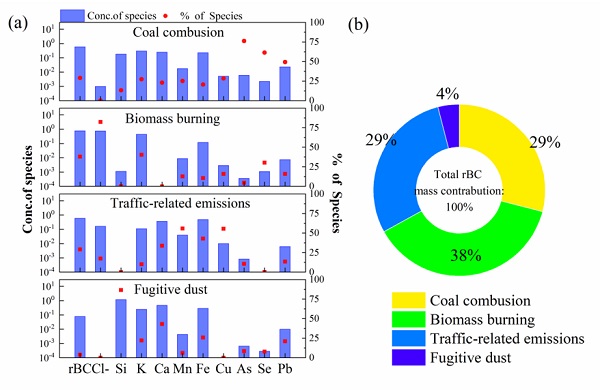 另外,他们还发现在观测期间黑碳的平均吸光增强倍数为1.37±0.11;经过源解析结果表明,二次老化、燃煤、扬尘、生物质燃烧和机动车排放对吸光增强倍数的贡献分别为37%、26%、15%、13% 和 9%。其中二次老化过程是主要贡献源。