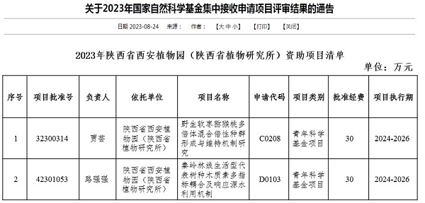 8月24日,国家自然科学基金委员会网站公布了《关于2023年国家自然科学基金集中接收申请项目评审结果的通告》(国科金发计〔2023〕62号)文件,陕西省西安植物园(陕西省植物研究所)贾芸和路强强两位博士获国家自然科学基金青年项目立项,分别为生命科学部“野生软枣猕猴桃多倍体混合倍性种群形成与维持机制研究”和地球科学部“秦岭林线生活型代表树种木质素多指标耦合及响应源水利用机制”,单项资助金额30万元。