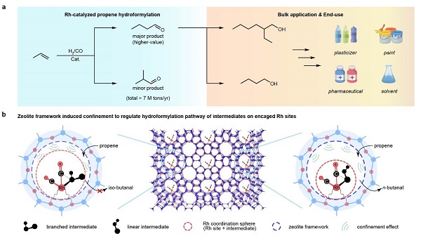 近日,中国科学院山西煤炭化学研究所曹直研究员团队与中科合成油技术股份有限公司团队在该研究方向取得了突破性进展,利用多相“铑-分子筛”负载型催化体系,首次实现了丙烯氢甲酰化以超高区域选择性制取出正丁醛。该团队将经典的分子筛骨架对反应中间体的“择形效应”拓展应用至分子筛骨架与结构清晰的铑活性位点之间形成的狭小限域空间,通过抑制在氢甲酰化反应中生成具有较大空间位阻的异丁醛中间体,实现了对目标产物正丁醛超过99%的区域选择性,同时醛类产物总选择性也高于99%,催化剂转化频率超过6500 h-1。上述催化性能结果超越了迄今为止报道的所有多相催化剂和几乎所有的均相催化剂。该研究不仅为如何通过多相催化的方法选择性获取热力学上更不稳定的反马式加成产物——正丁醛提供了一种新方法,也进一步拓展了经典分子筛骨架“择形催化”这一概念,也为目前丙烯氢甲酰化工业生产中存在的巨大挑战提供了新的解决思路与方法。